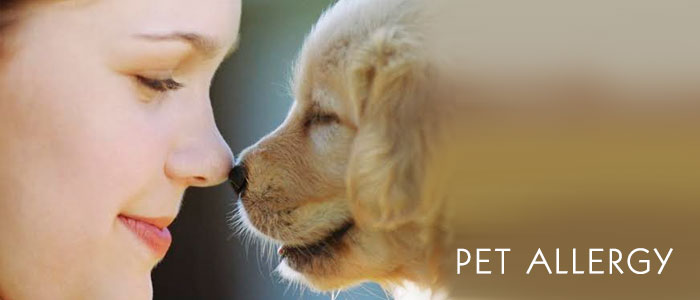 Pet allergy is an allergic reaction to proteins found in an animal's skin cells, saliva or urine. Signs of pet allergy include those common to hay fever, such as sneezing and runny nose. Some people may also experience signs of asthma, such as wheezing and difficulty breathing.